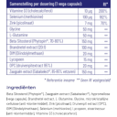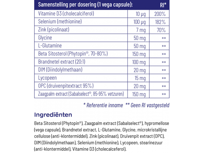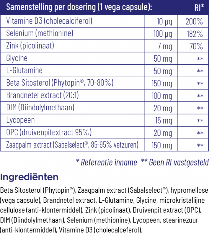 Overige ingrediënten: Beta Sitosterol (Phytopin®), Zaagpalm extract (Sabalselect®), hypromellose (vega capsule), Brandnetel extract, L-Glutamine, Glycine, microkristallijne cellulose (anti-klontermiddel), Zink (picolinaat), Druivenpit extract (OPC), DIM (Diindolylmethaan), Selenium (methionine), Lycopeen, stearinezuur (anti-klontermiddel), Vitamine D3 (cholecalceferol).