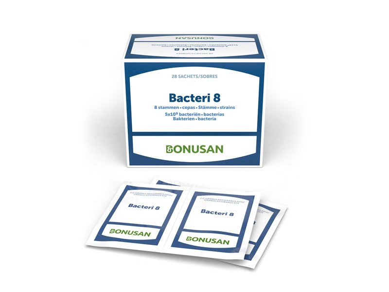 Bacteri 8 van Bonusan wordt geleverd in sachets. Dit biedt een optimale bescherming tegen vocht, licht en lucht. Je kunt ze makkelijk meenemen en vermengen met water. Bacteri 8 bevat minimaal 5 miljard bacteriën.