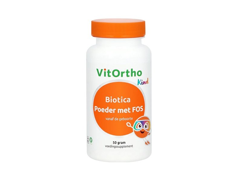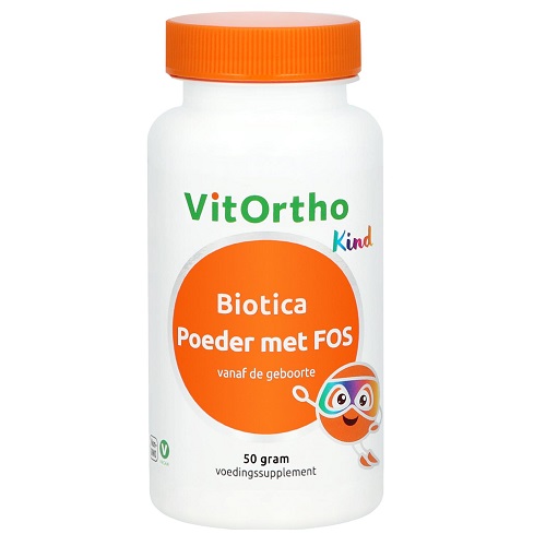 Biotica poeder met FOS van VitOrtho is een probioticapreparaat geschikt voor kinderen en baby's. Het is oplosbaar in water, afgekolfde borstvoeding of flesvoeding. Een halve theelepel (dagdosering à 1 gram) bevat 1,5 miljard micro-organismen.
