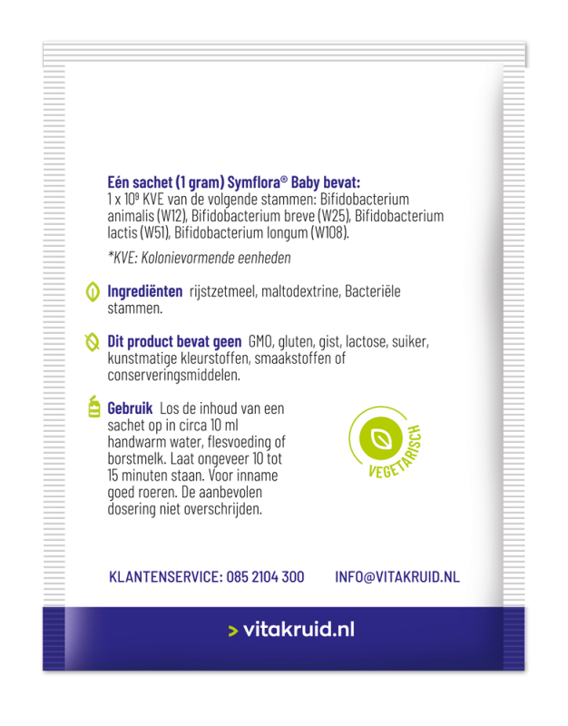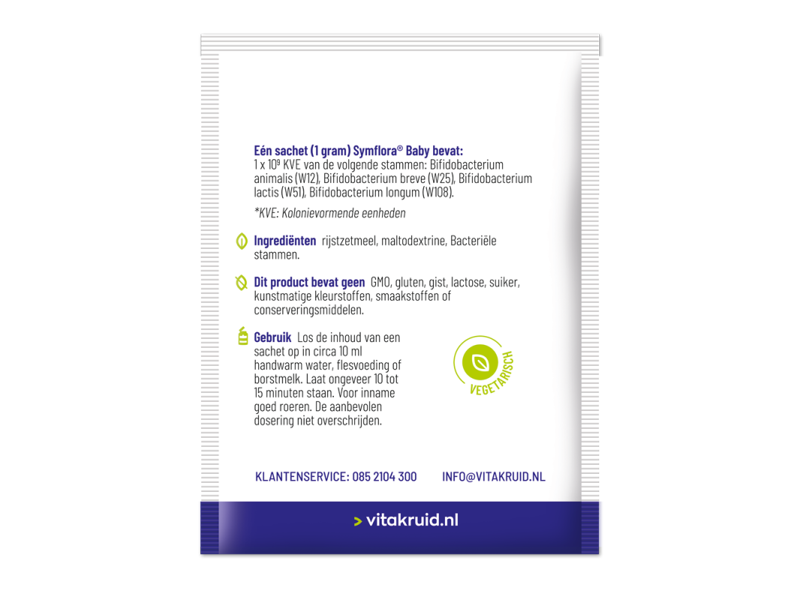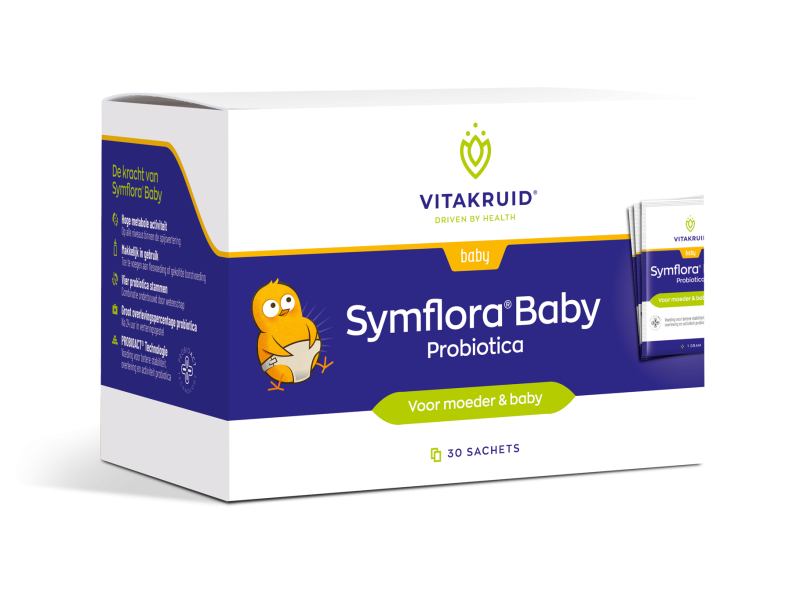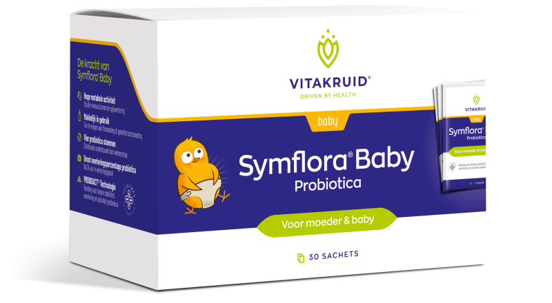 Vitakruid Symflora Baby is een probioticapoeder voor zowel de moeder als de baby. Het bevat 4 verschillende bifidobacterie stammen. Dit probioticasupplement is speciaal samengesteld voor het belangrijke eerste levensjaar van de pasgeboren baby.