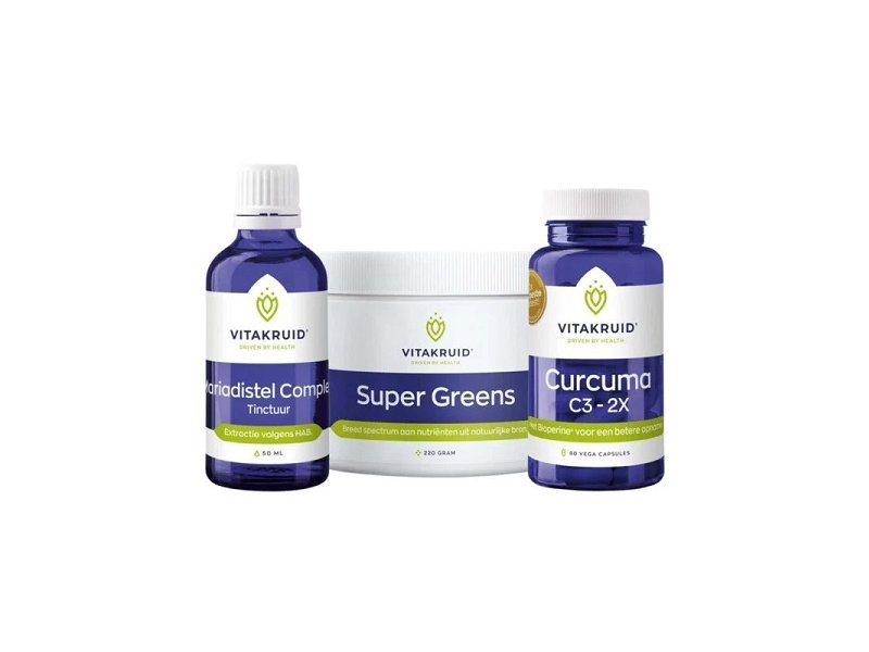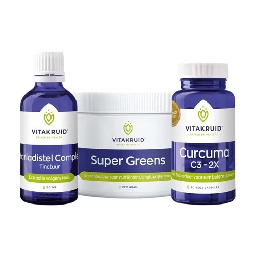 De Lever Detox Bundel van Vitakruid bestaat uit 3 verschillende supplementen namelijk; Mariadistel Tinctuur (50 ml), Super Greens (220 gram) en Curcuma C3 - 2x (60 capsules).