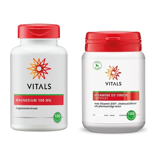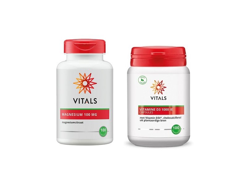 Dit suppletie pakket van Vitals bevat een pot Magnesium citraat (100 capsules) en een pot Vitamine D3 (100 capsules). De Vitamine D3 in dit pakket is afkomstig van algen en daarmee volledig plantaardig en geschikt voor vegetariërs en veganisten. Ook Vitals Magnesium citraat kan door deze doelgroep gebruikt worden.