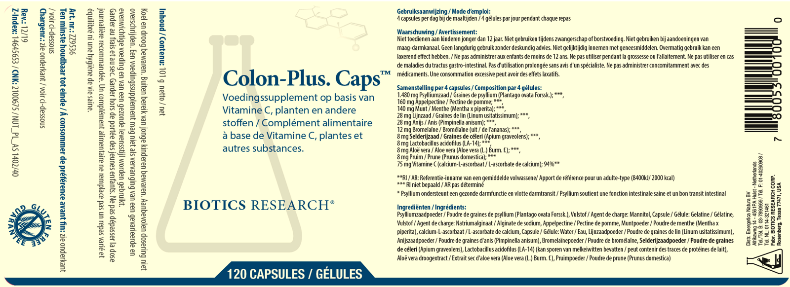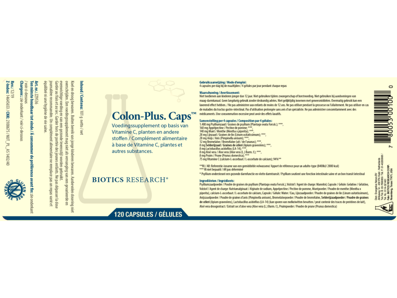 Biotics Colon-Plus is een complex met als hoofdbestandsdeel psylliumzaad (poeder). Het complex is verder aangevuld met onder andere lijnzaad, anijs, pruim, vitamine C, munt en appelpectine.