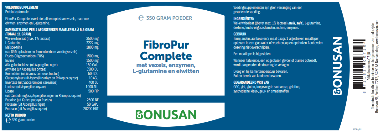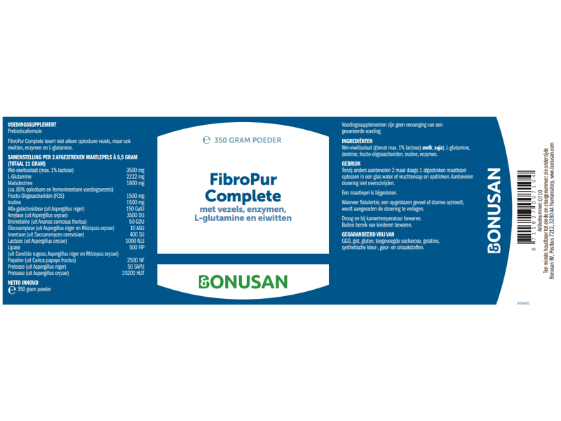 Bonusan FibroPur Complete (voorheen Prebio Complete) is een compleet voedingsvezels supplement. Het bevat naast fermenteerbare vezels ook een brede mix van enzymen, eiwitten en het aminozuur L-glutamine.
