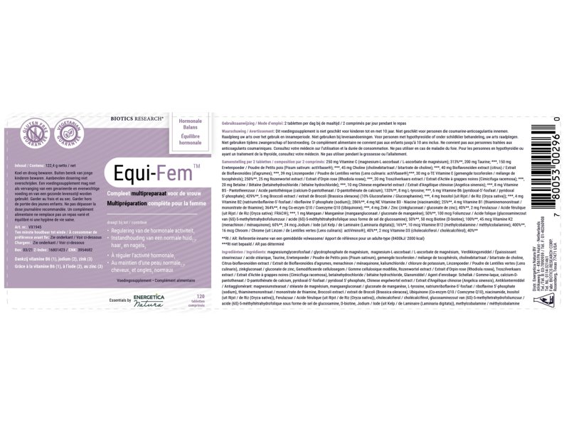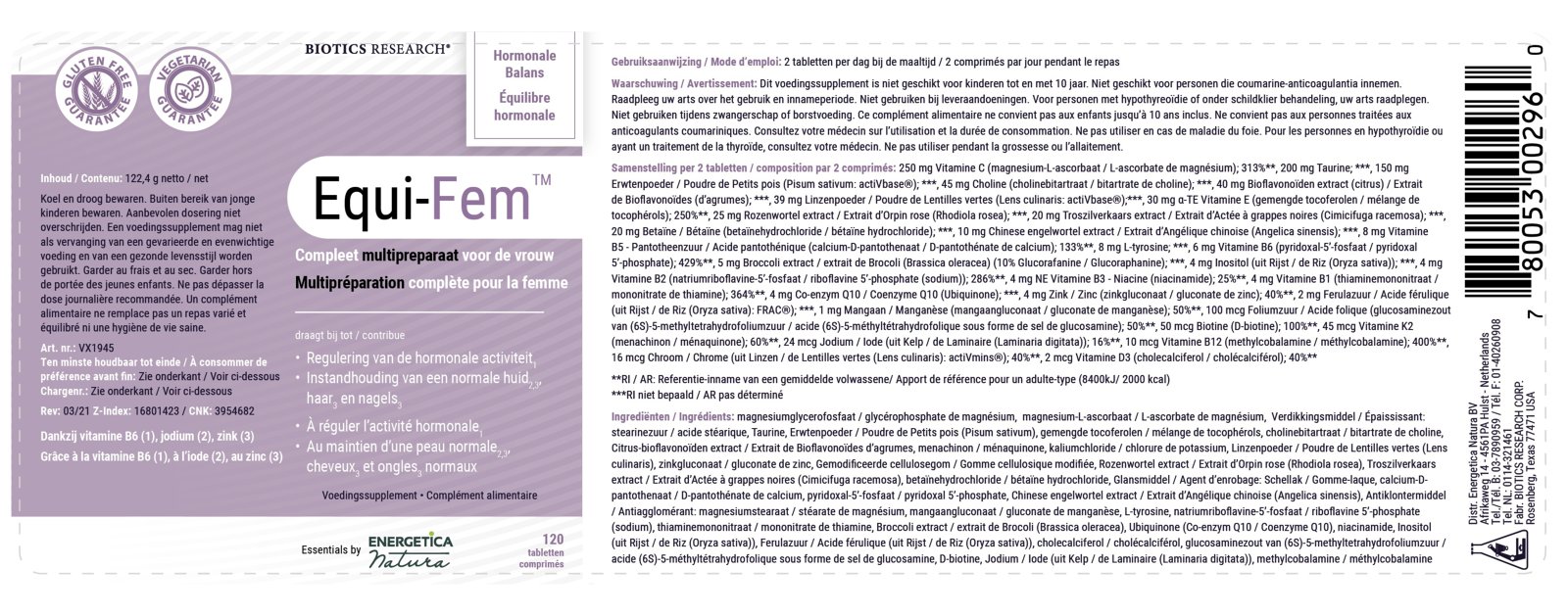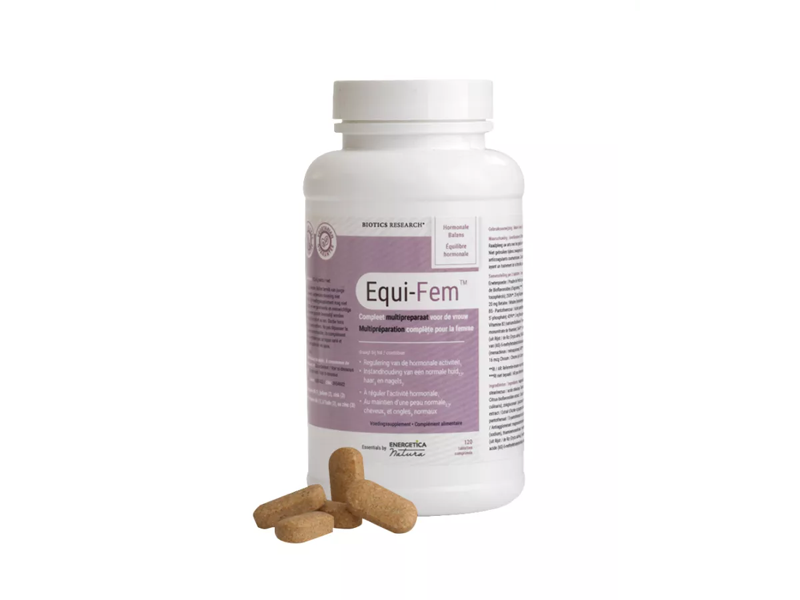 Biotics Equi-Fem is een compleet multipreparaat voor vrouwen. Naast de veelvoorkomende vitamines en mineralen bevat dit supplement ook een uitgekiend complex met angelica sinensis, rhodiola rosea en broccolli-extract. Equi-Fem heeft een hoge dosering taurine.