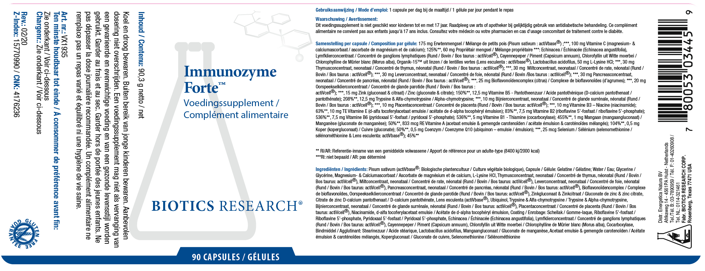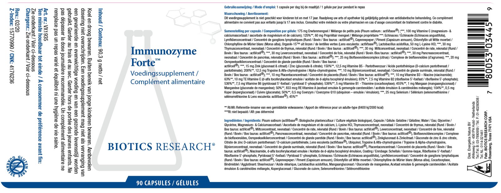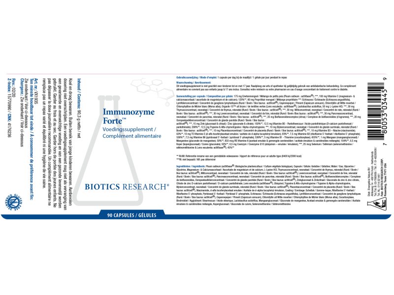 Immunozyme Forte van Biotics is een supplement met verschillende vitamines, mineralen, orgaanconcentraten, kruiden en probiotica. Dit in een specifieke samenstelling ter ondersteuning van het immuunsysteem.