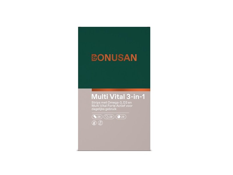 De Multi Vital 3-in-1 Basissuppletie set bevat de drie belangrijkste basissupplementen in een handige maandverpakking. In de gemakkelijk mee te nemen blisters zitten omega 3 softgels, vitamine D softgels en een goede multivitamine. Zo profiteer je dagelijks van de nodige vitamines, mineralen en omega 3 vetzuren.