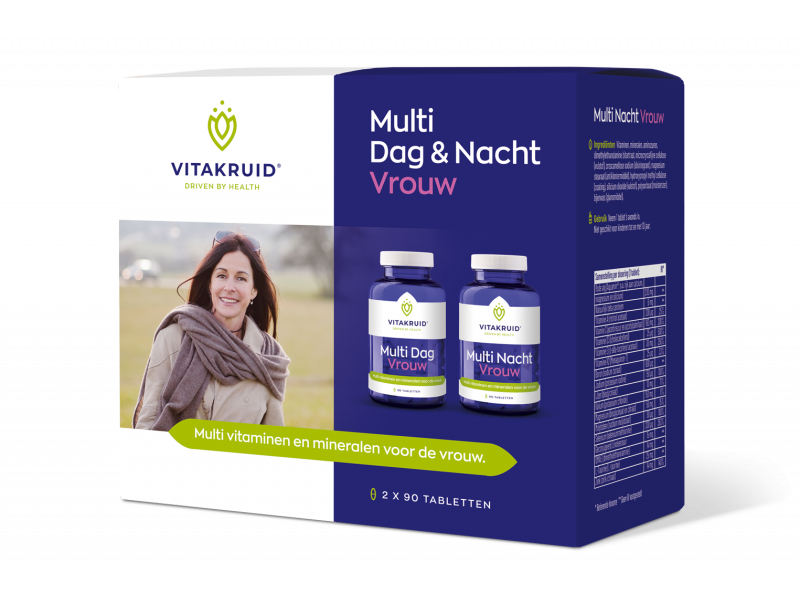 Vitakruid Multi Dag en Nacht Vrouw is een speciale multivitamine voor vrouwen. Omdat we overdag andere vitamines en mineralen nodig hebben dan in de nacht, bevat deze formule de tabletten voor zowel overdag als in de nacht.