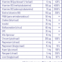 Ingrediënten samengevat: Vitaminen, mineralen, aminozuren, dimethylethanolamine bitartraat, microcrystallijne cellulose (vulstof), croscamellose sodium (disintegrant), magnesium stearaat (antiklontermiddel), hydroxypropyl methyl cellulose (coating), silicium dioxide (vulstof),  polysorbaat (moisterizer), bijenwas (glansmiddel).