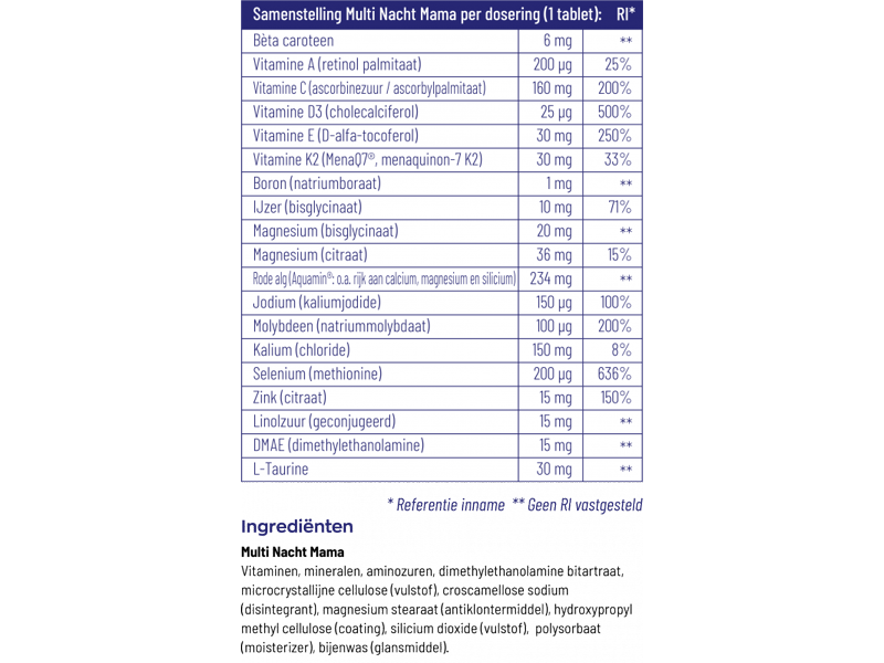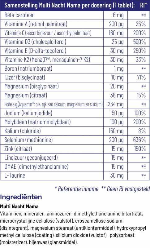 De Gezondheidsraad adviseert zwangere vrouwen om extra vitamine D te nemen. Multi Nacht Mama bevat een riante vitamine D3 hoeveelheid van 25 mcg. Verder bevat de nachtvariant nutriënten voor de opbouw van spier- en hersenweefsel en bevordert het de gezonde nachtrust. De vitamines, mineralen en overige nutriënten helpen onder andere bij het herstel van de huid (vitamine A), ondersteunen het immuunsysteem (vitamine D3) en ondersteunen de botgezondheid (rode alg).