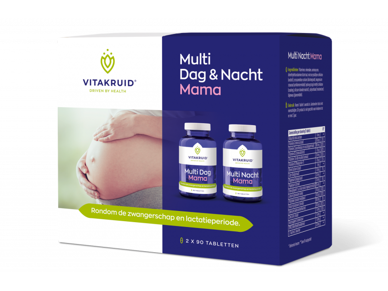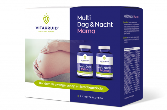 Vitakruid Multi Dag & Nacht Mama is een multivitamine voor zwangere vrouwen, vrouwen die zwanger willen worden en voorziet in de voedingsstoffen die goed zijn rondom de lactatieperiode.