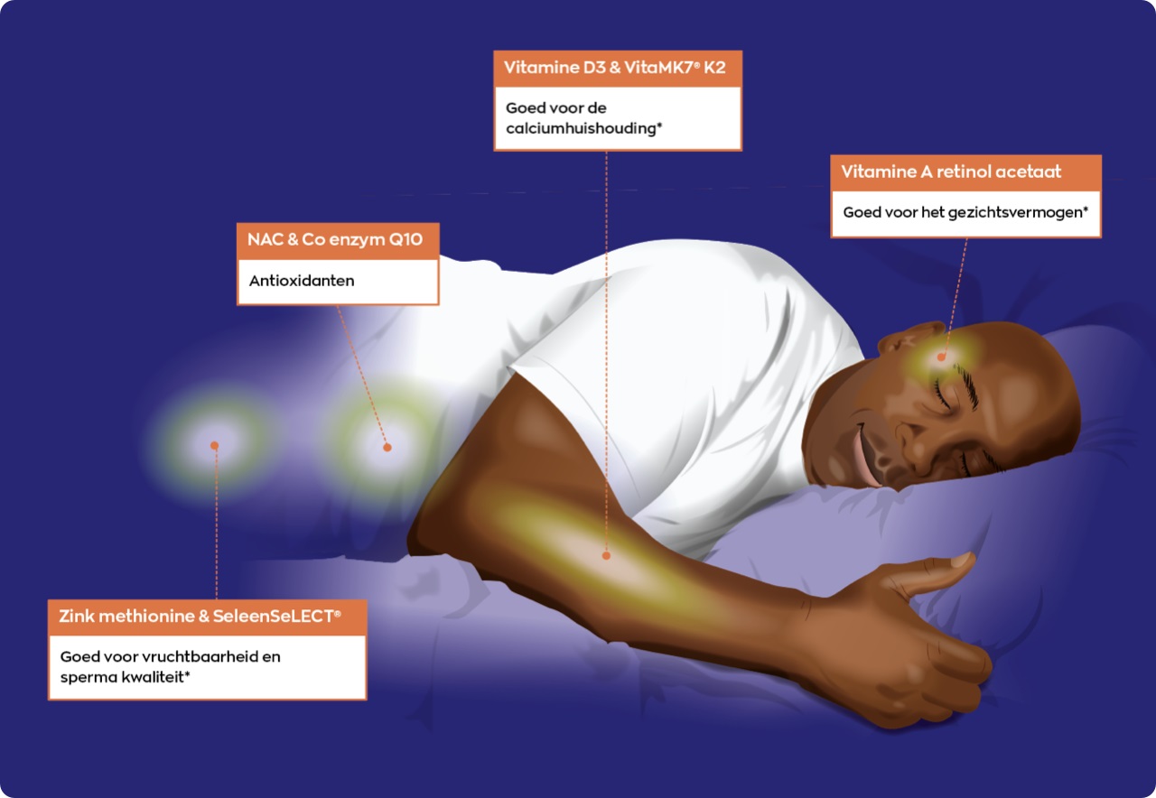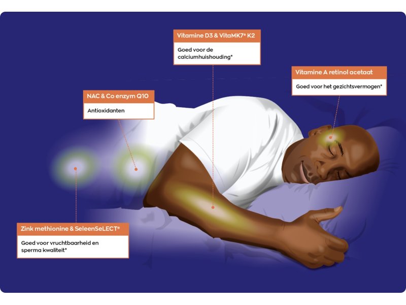 Multi Nacht Man is een supplement die je kunt innemen voor het slapen gaan. Het ondersteunt het herstellend vermogen van de huid, biedt een natuurlijke libido ondersteuner en werkt als antioxidant.