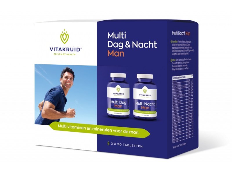 Vitakruid Multi Dag & Nacht Man is een combipakket met Multi Dag Man en Multi Nacht Man. Beide supplementen vullen elkaar goed aan.