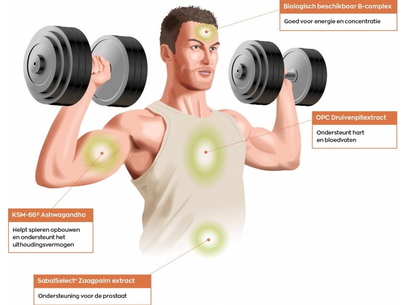 Overige ingrediënten: Vitaminen, mineralen, microcrystalline cellulose (anti-klontermiddel), Choline bitartraat, PABA (para-aminobenzoëzuur), Inositol, Ashwagandha (KSM-66®) (melk), Citrus bioflavonoiden, stearinezuur (anti-klontermiddel), Zaagpalm extract (Sabalselect®), Trimethylglycine, Druivenpit extract (OPC), HPMC (glansmiddel), Alpha-liponzuur, Lycopeen, glycerol (bevochtigingsmiddel)