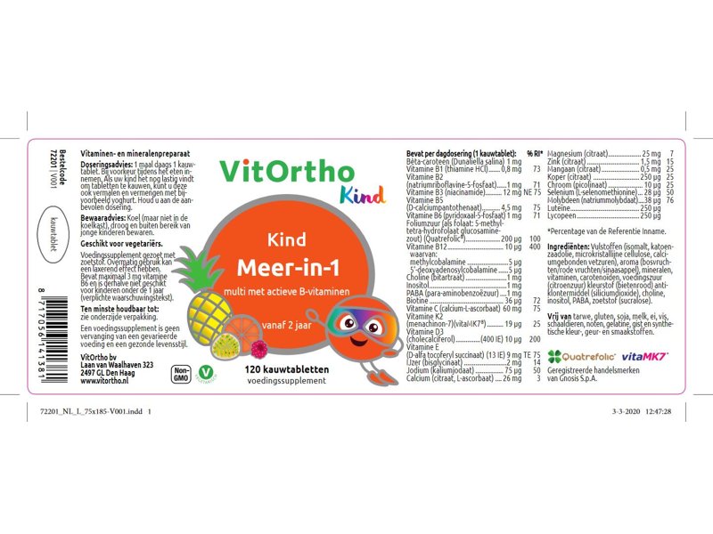 Meer-in-1 Kind van Vitortho is een Multivitamine speciaal voor kinderen vanaf 2 jaar. De kauwtabletten hebben een lekkere citrus/bosvruchtensmaak en zijn gezoet met Stevia.