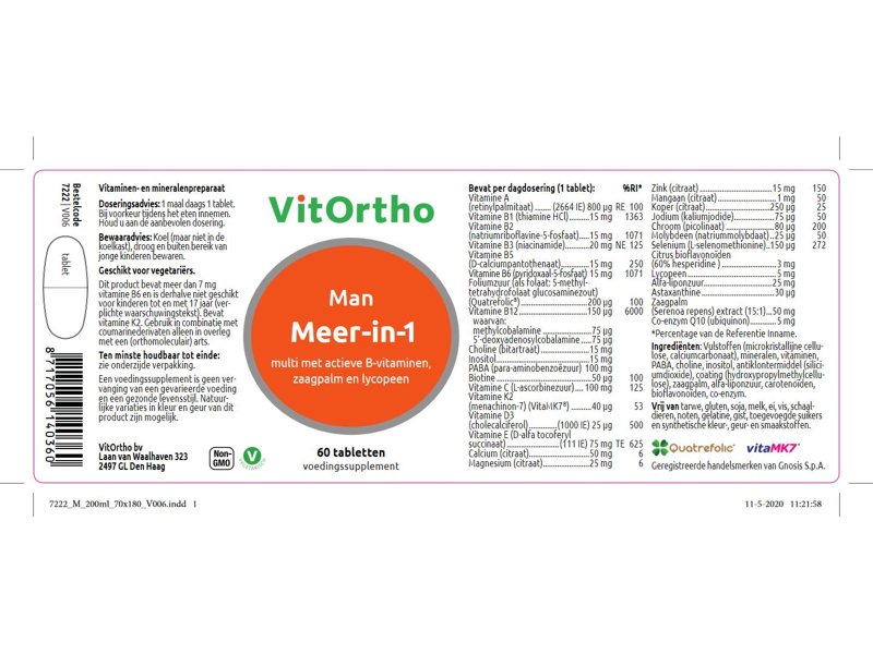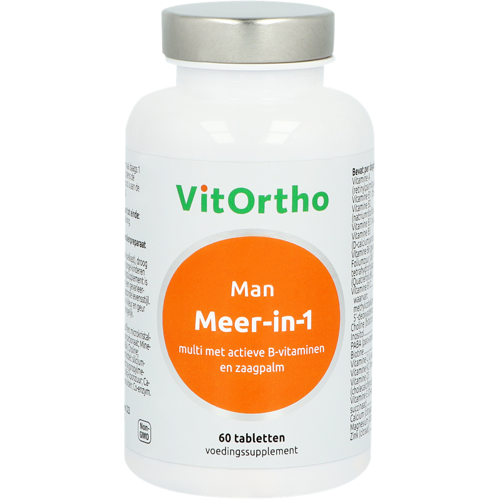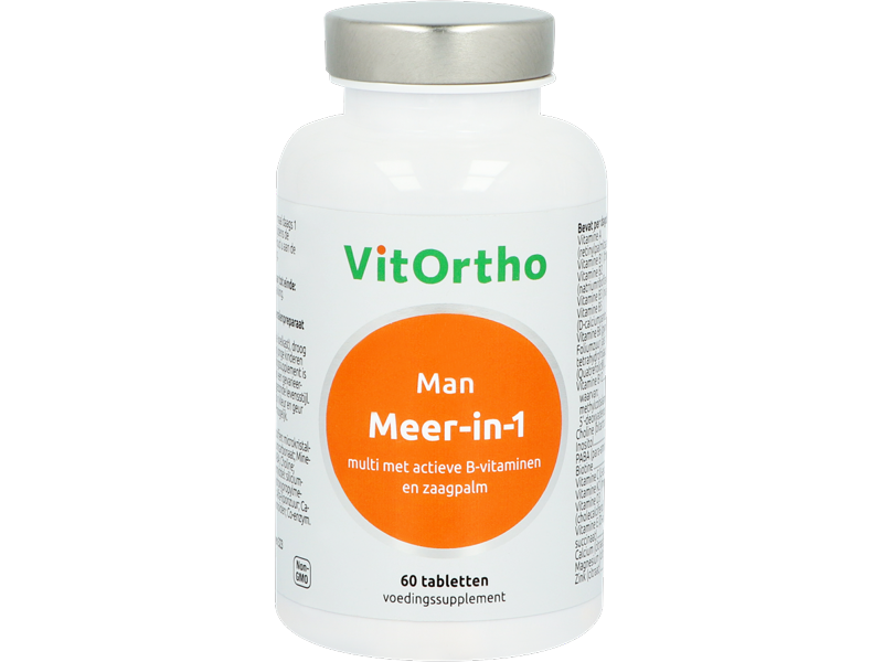 Vitortho Meer-in-1 Man is een multivitamine die zich richt op de vitamine- en mineralenbehoefte van de man. Dit product bevat de biologisch actieve vormen van B2, B6, B12 en Foliumzuur. Naast organische mineraalverbindingen bevat het ook lycopeen, zaagpalm, co-enzym Q10, alfa-liponzuur en astaxanthine.