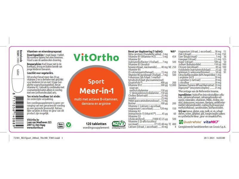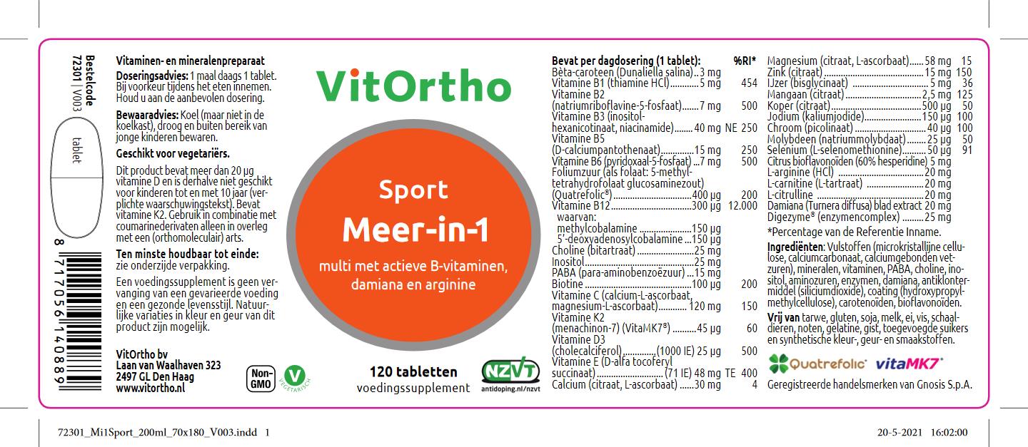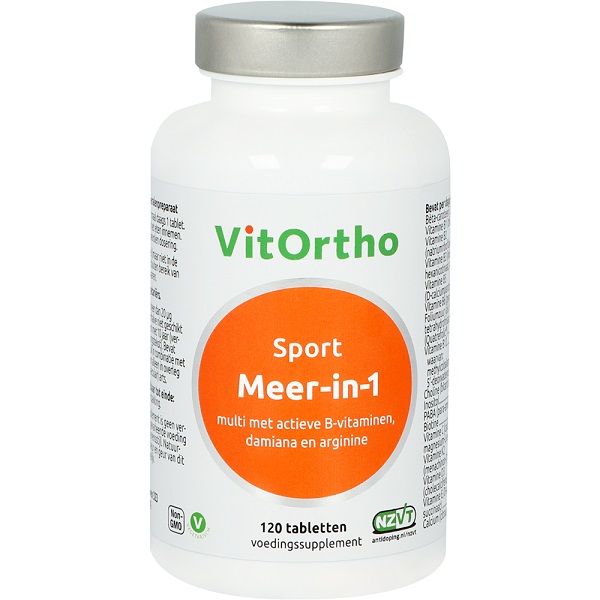 Vitortho Meer-in-1 Sport is een multivitamine speciaal ontwikkeld voor de sporter. Deze multivitamine bevat de biologische vormen van foliumzuur, Vitamine B2, B6 en B12.