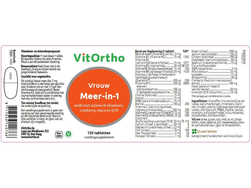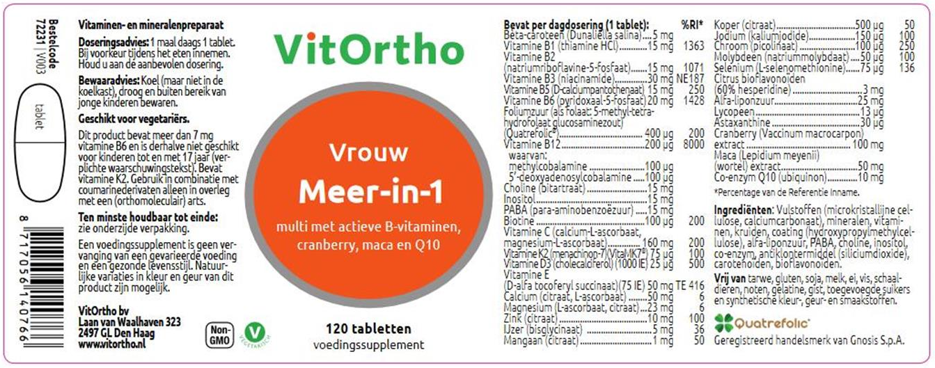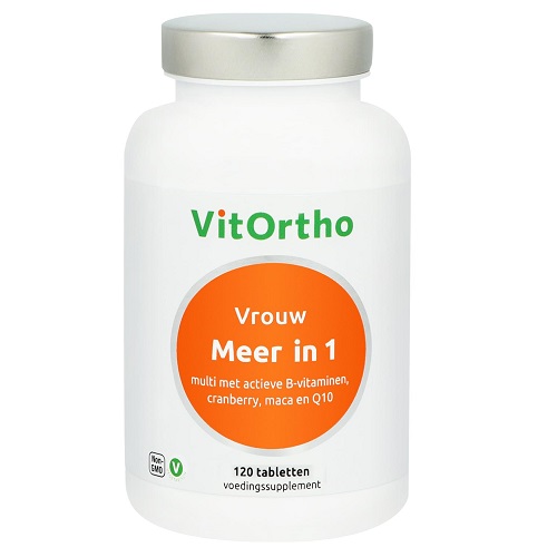 VitOrtho Meer-in-1 Vrouw is een multivitamine die is afgestemd op de behoefte van vrouwen. Een breed multivitamine complex met onder andere de actieve vormen van B2, B6, B11 en B12, ijzer is goed opneembare vorm, Vitamine K2 als menachinon en een natuurlijke vitamine E. Deze multi is ook aangevuld met cranberry, maca, Co-enzym Q10 en astaxanthine.