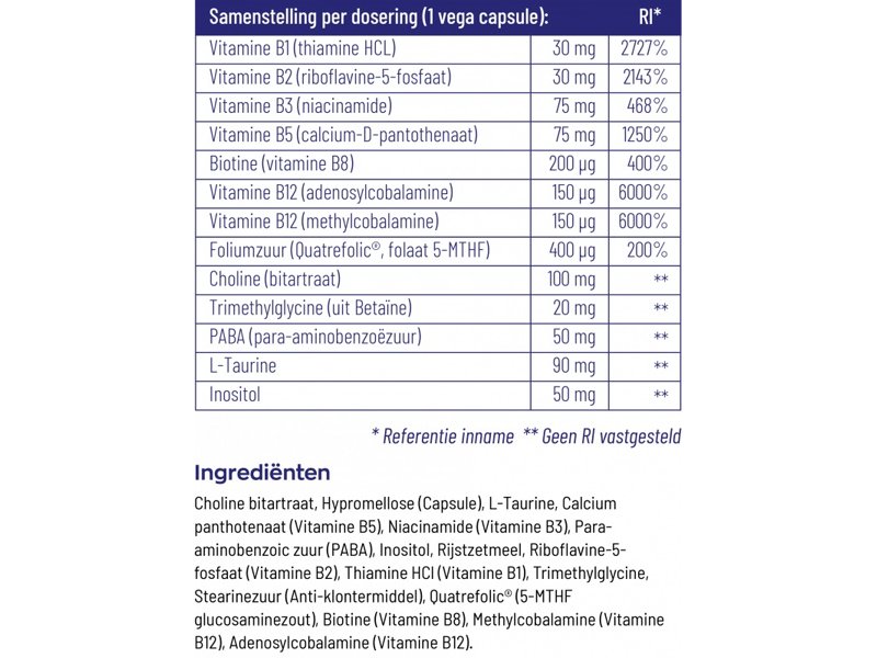 Overige ingrediënten: choline bitartraat, hypromellose (capsule), niacinamide (vitamine B3), calcium panthotenaat (vitamine B5), para-aminobenzoic zuur (PABA), Inositol, L-taurine, thiamine HCl (vitamine B1), rijstzetmeel, riboflavine-5-fosfaat (vitamine B2), trimethylglycine, pyridoxaal-5-fosfaat (vitamine B6), stearinezuur (anti-klontermiddel), Quatrefolic® (5-MTHF glucosaminezout), biotine (vitamine B8), methylcobalamine (vitamine B12), adenosylcobalamine (vitamine B12).