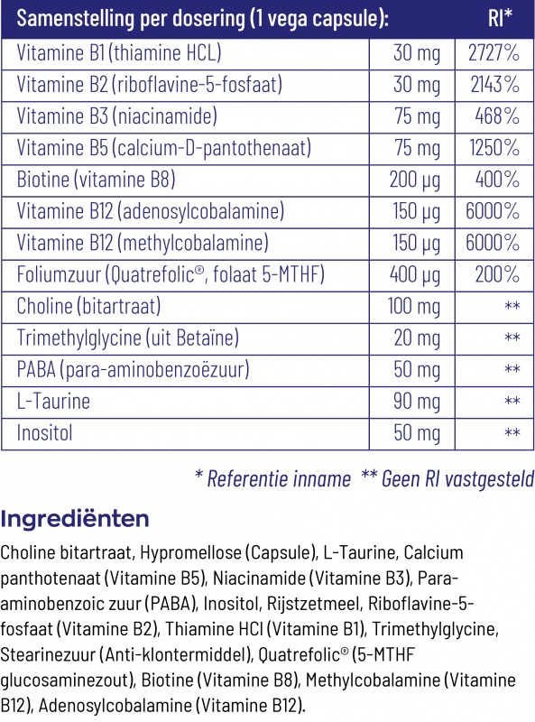 Overige ingrediënten: choline bitartraat, hypromellose (capsule), niacinamide (vitamine B3), calcium panthotenaat (vitamine B5), para-aminobenzoic zuur (PABA), Inositol, L-taurine, thiamine HCl (vitamine B1), rijstzetmeel, riboflavine-5-fosfaat (vitamine B2), trimethylglycine, pyridoxaal-5-fosfaat (vitamine B6), stearinezuur (anti-klontermiddel), Quatrefolic® (5-MTHF glucosaminezout), biotine (vitamine B8), methylcobalamine (vitamine B12), adenosylcobalamine (vitamine B12).