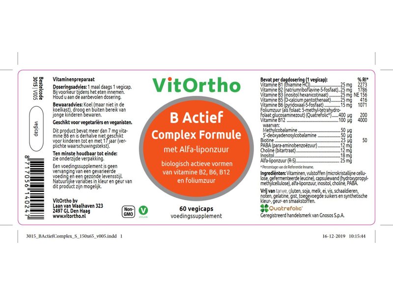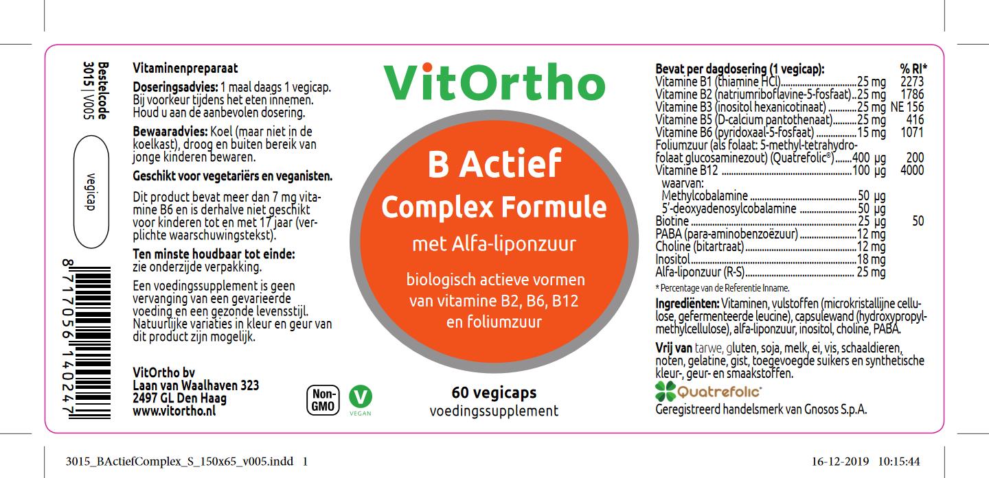 Het B Actief Complex Formule van VitOrtho bevat naast de B-Vitaminen ook Alfa-liponzuur. Het Vitamine B Complex heeft de actieve vormen van B2, B6, B12 en Foliumzuur. Dit product bevat ook Choline, Inositol en PABA.