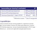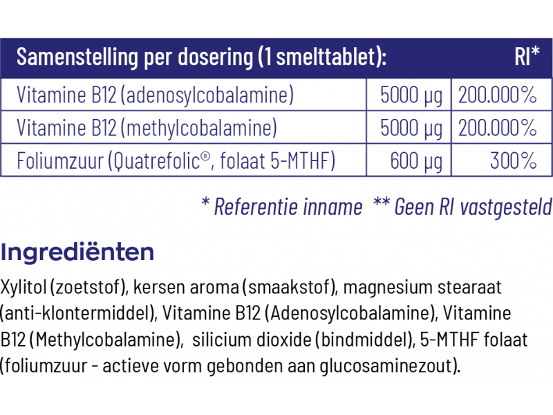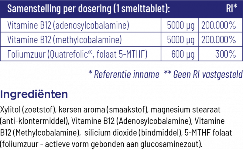 Ingrediënten samengevat:Xylitol (zoetstof), natuurlijke kersen aroma (smaakstof), magnesium stearaat (anti-klontermiddel), Vitamine B12 (Adenosylcobalamine), Vitamine B12 (Methylcobalamine), silicium dioxide (bindmiddel), 5-MTHF folaat (foliumzuur - actieve vorm gebonden aan glucosaminezout).