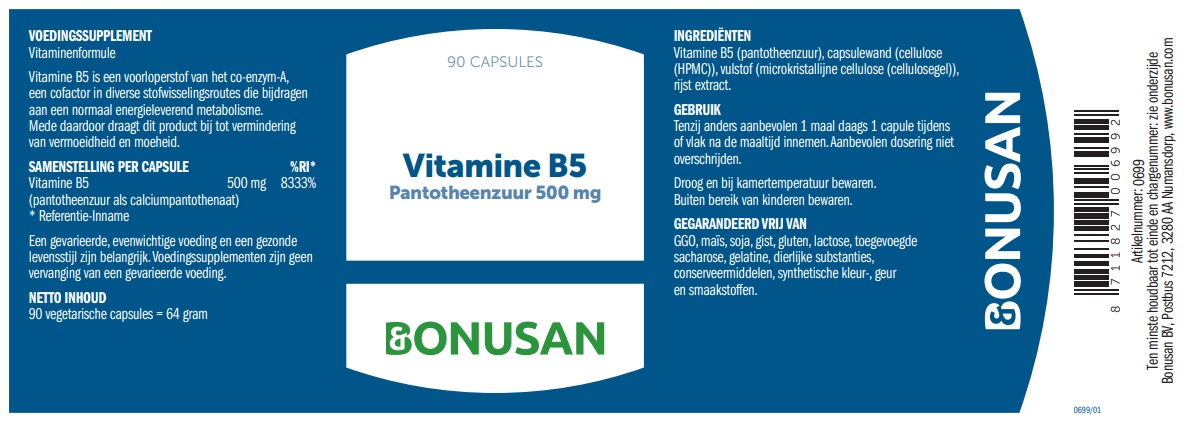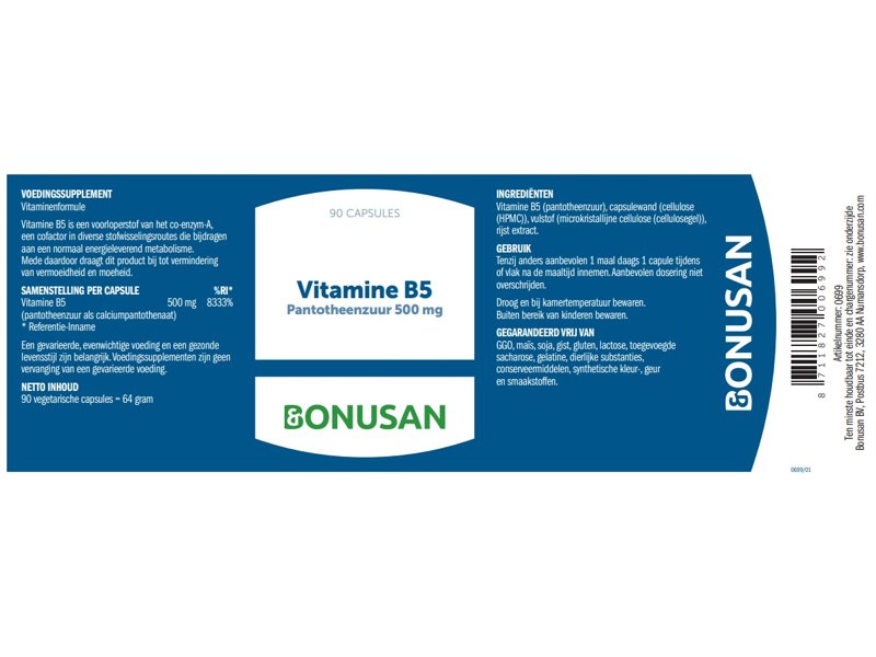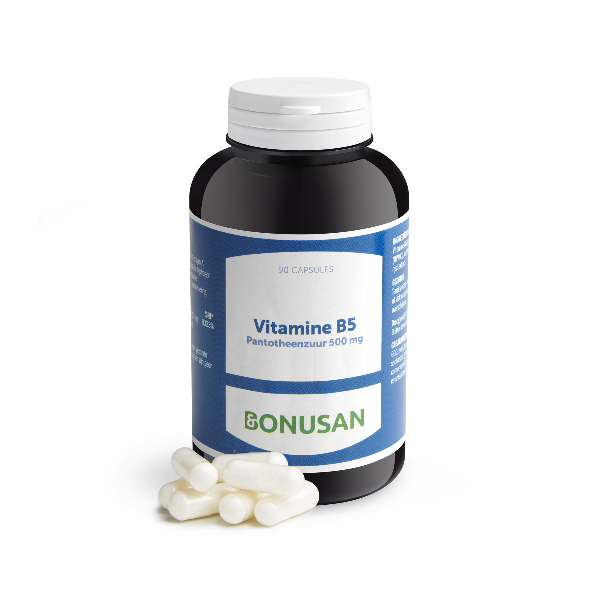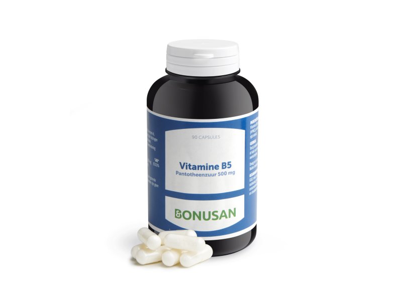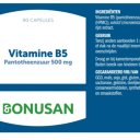De Bonusan Vitamine B5 capsules bevatten een hoge dosering van 500 mg B5 als calciumpantothenaat. Vitamine B5 Pantotheenzuur ondersteunt het energieniveau en is goed bij vermoeidheid. Ook geeft het ondersteuning in stress situaties en draagt het bij aan normale mentale prestaties.