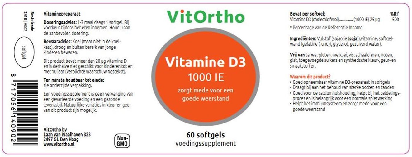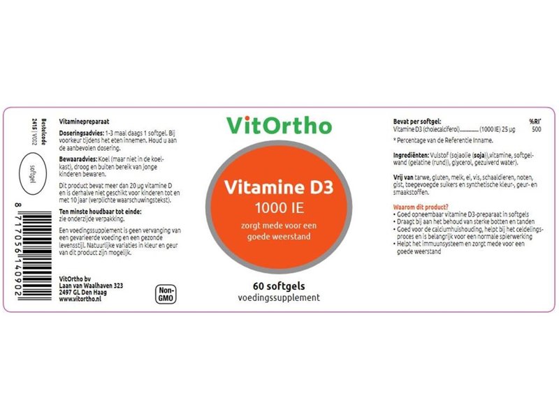 VitOrtho Vitamine D3 1000 IE is een Vitamine D supplement met 25 mcg per softgel. De softgels bevatten olijfolie wat zorgt voor een betere opname.