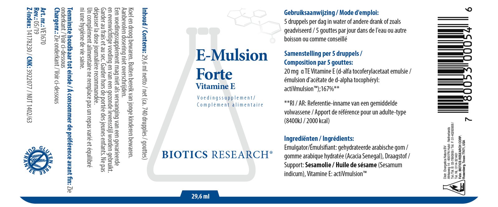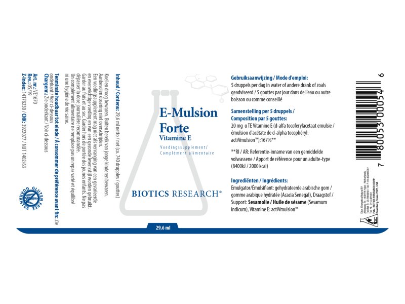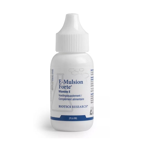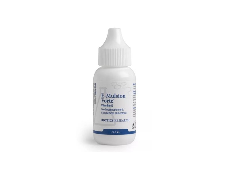 Biotics E-Mulsion Forte is een vloeibaar vitamine E supplement. De druppels zijn toe te voegen aan water, thee, vruchtensap of aan een andere drank. Het betreft een geëmulgeerde Vitamine E. Elke druppel is goed voor 4 mg α-TE Vitamine E d-alfa-tocoferylacetaat.
