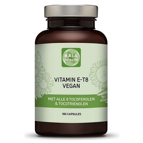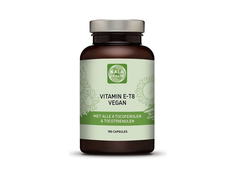 Met Kala Health Vegan Vitamine E-T8 haal je een Vitamine E complex in huis met alle 8 vormen van Vitamine E. De capsules bevatten de alfa, beta, gamma en delta vom van tocoferolen en tocotriënolen.