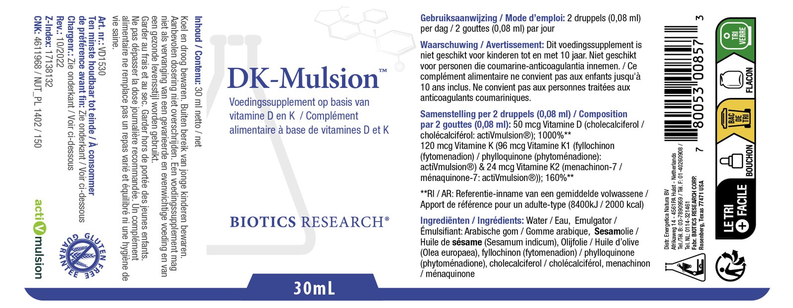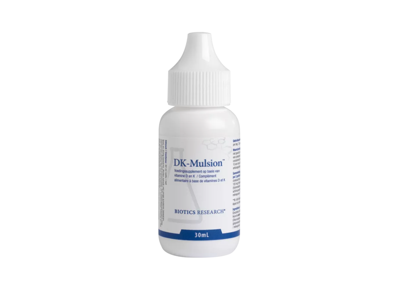 Biotics DK-Mulsion is een vloeibaar Vitamine K1, K2 en D3 supplement. De opname gaat via de slijmvliezen en het lymfestelsel. De opname gaat hierdoor snel en de nutriënten worden vrijwel volledig opgenomen.